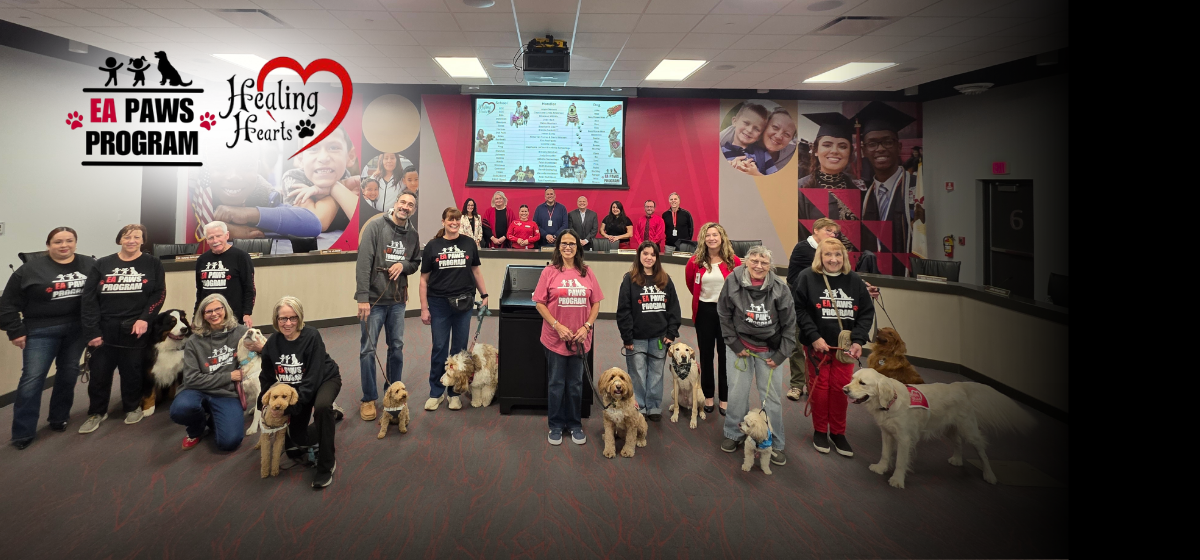 The goal of EA PAWS is to support students’ emotional well-being, reduce stress and anxiety, and promote a safe, welcoming learning environment through structured and supervised interactions with certified comfort dogs. These interactions provide students with opportunities to build coping skills, regulate emotions, and develop positive connections within their school community. Whether supporting students during times of heightened stress, celebrating milestones, or simply offering a calm presence in the school day, our EA PAWS teams have become an integral part of the student… and staff experience.